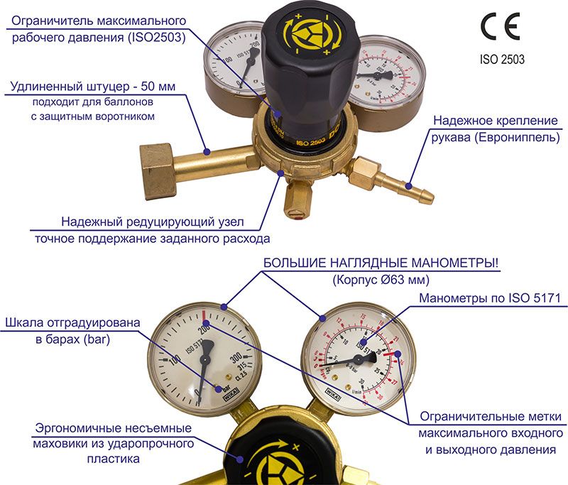 Предназначен для понижения давления газа аргона / углекислоты, поступающего в регулятор из баллона, и поддержания постоянным заданного расхода газа при питании электросварочных постов и установок.