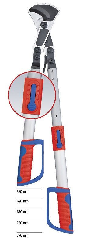 - рассчитанная на большую нагрузку раздвижная ручка из алюминиевой трубы овального сечения; увеличивается до 770 мм для максимальной длины плеча рычага при резке кабеля большого сечения, задвигается до длины 570 мм для минимального размера при транспортировке;