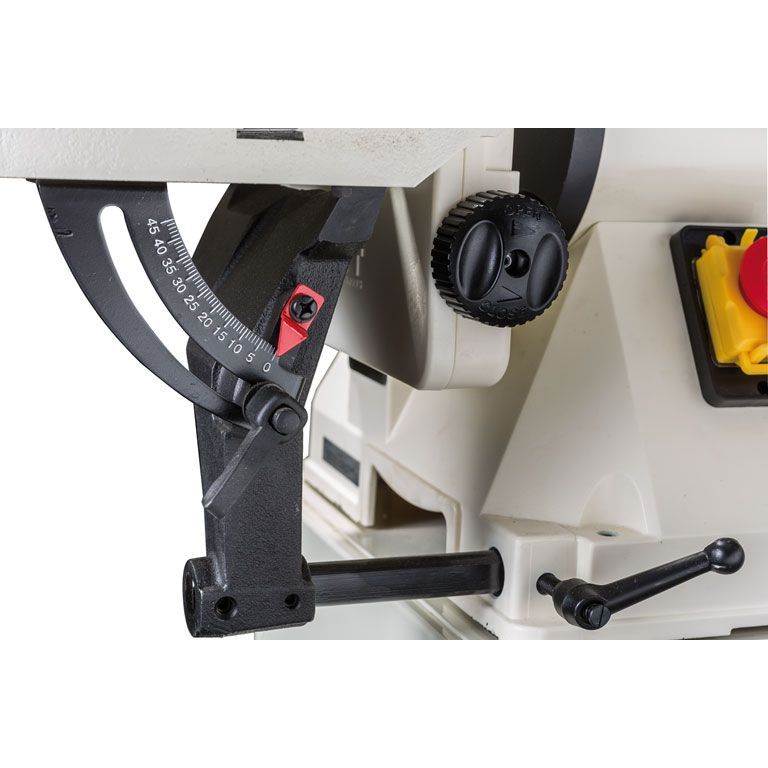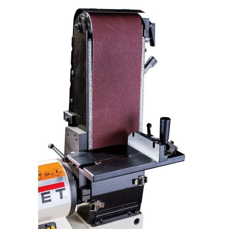 Ленточно-шлифовальный узел обеспечивает быстрый съём материала и удобен при работе с длинными заготовками. Для лёгкого скольжения ленты и минимизации нагрева от трения использована сменная графитовая подложка. Весь узел можно расположить вертикально, горизонтально или под любым промежуточным углом. Синхронно с узлом наклоняется и столик-упор; чтобы установить его под углом к плоскости ленты, используют отдельный механизм регулировки наклона.