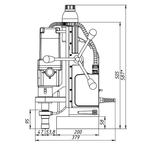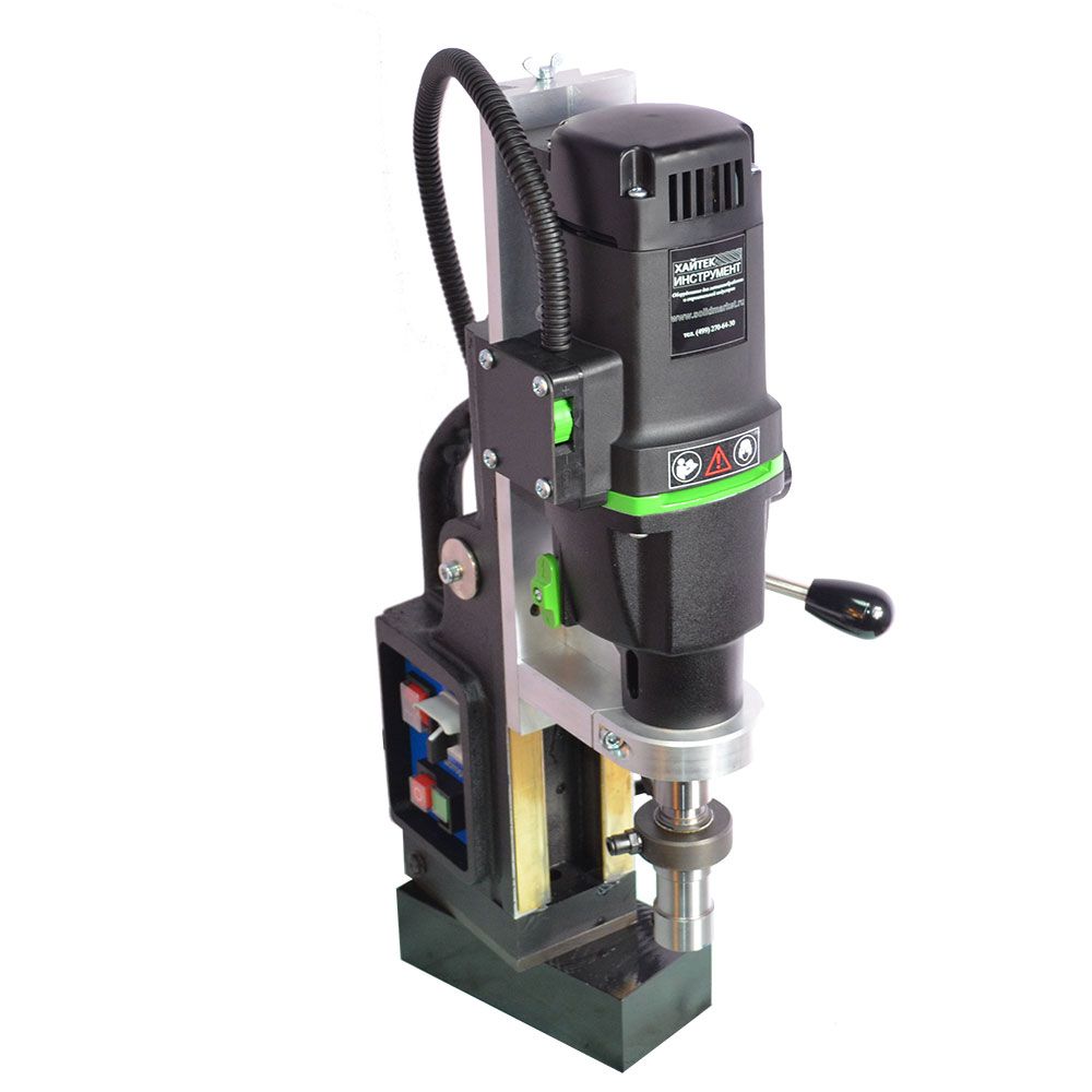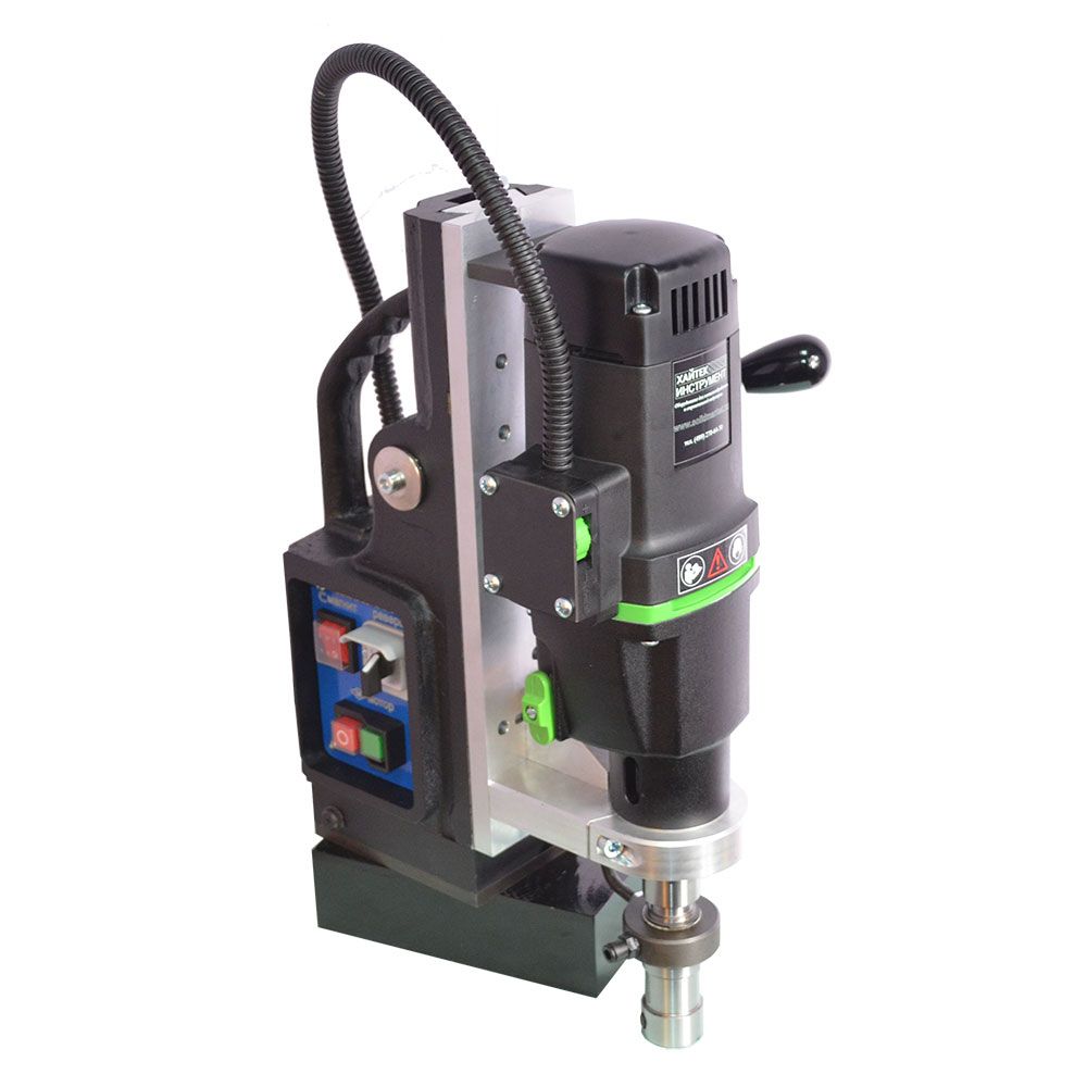 Предназначен для промышленного использования, сверления большого количества отверстий диаметром до 100 мм., также будет надежен при использовании спиральных сверл диаметром до 32 мм. Нарезка глухой резьбы возможна без специальных резьбонарезных патронов. Подвижное основание относительно магнита. Это станок с подвижным магнитным основанием, то есть при активированном электромагните возможно разъединить жесткую связь станины с магнитом и отрегулировать положение центра сверла, потом снова жестко закрепить станок поворотом рукоятки. Эта функция весьма полезна при сверлении вертикальных поверхностей, потому что трудно с первой попытки попасть довольно тяжелым магнитым станком в центр будущего отверстия. На магнитных станках зарубежных производителей такая функция называется "магнитное основание с юстировкой".