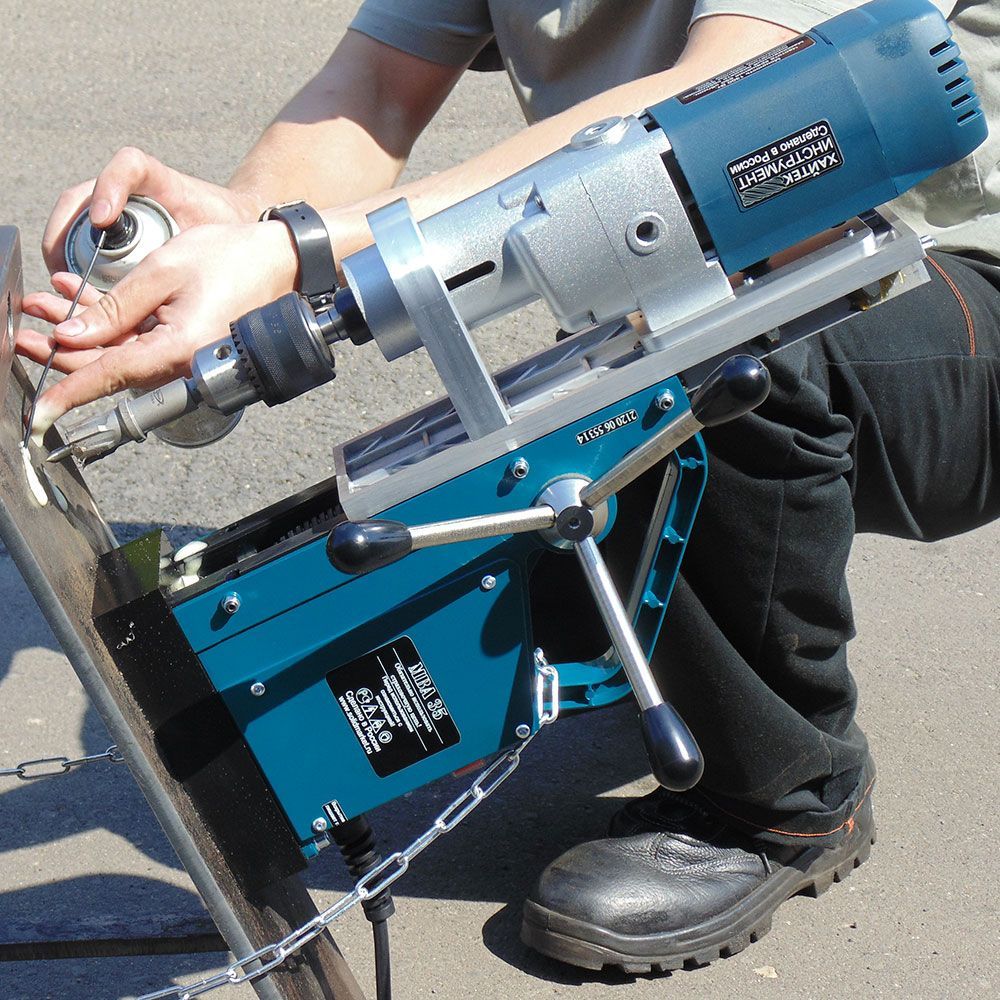 Основой предложения является сверлильный станок 1,3 кВт с Конусом Морзе "2" оснащенный магнитной подошвой с прижимной силой почти 2 тонны. В комплекте сверлильный патрон до 16 мм и страховочная цепь, на случай если при сверлении на высоте произойдет обрыв цепи питания и магнитная подошва деактивируется. В остальном, сверлильный станок на магнитной подошве "MBA 35" работает почти как настольный станок. Вообще, магнитная подошва МВА-35 - это надежный и мощный электромагнит, который удерживает стальной лист толщиной 10 мм с силой 20 000 Н. Этого достаточно, чтобы сверлильный станок на магнитной подошве не отрывался под действием силы человека, даже если висит вверх ногами.