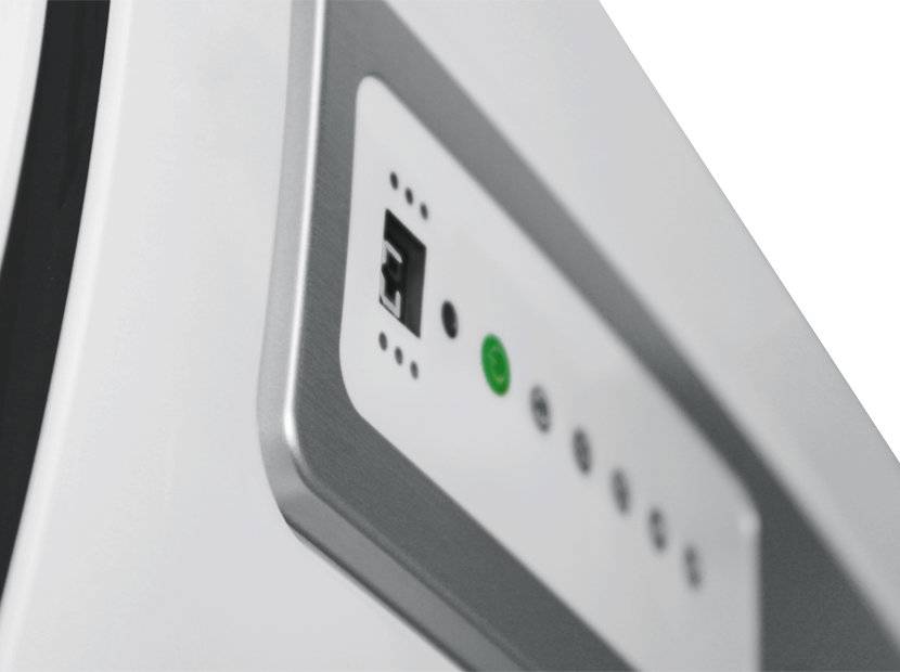 Панель управления мобильного кондиционера содержит функциональные клавиши, LED-дисплей, на котором отражается существующая и заданная температура. При установке, желаемой для пользователя температуры в помещении, на экране в течение 5 секунд высвечивается заданная температура, после чего снова отображается существующая на данный момент. Также на панели управления расположены индикаторы, позволяющие контролировать работу прибора для достижения оптимального комфорта: