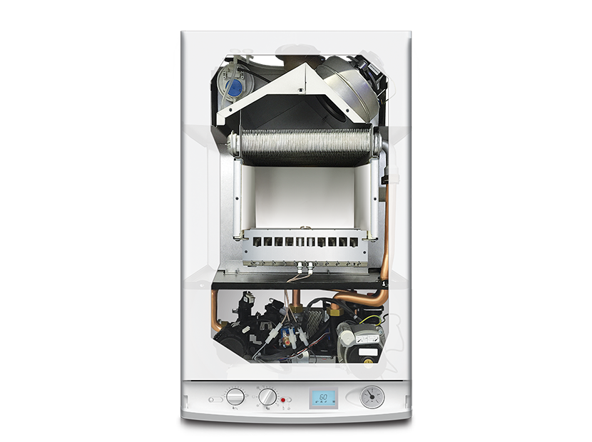 Газовый котел оснащен пластинчатым теплообменником увеличенной площади, комплектуется открытой (i) или закрытой камерой сгорания (Fi). Пластинчатый теплообменник осуществляет передачу тепла от горячего теплоносителя к холодной среде. Многоуровневая система безопасности представлена несколькими конструктивными элементами прибора: дифференциальным манометром, датчиком минимального давления, нормально закрытым газовым клапаном, аварийным сбросным клапаном, ионизационным контролем наличия пламени, функцией авторестарта, а так же расширенной системой самодиагностики с визуальным отображением кодов неисправностей.