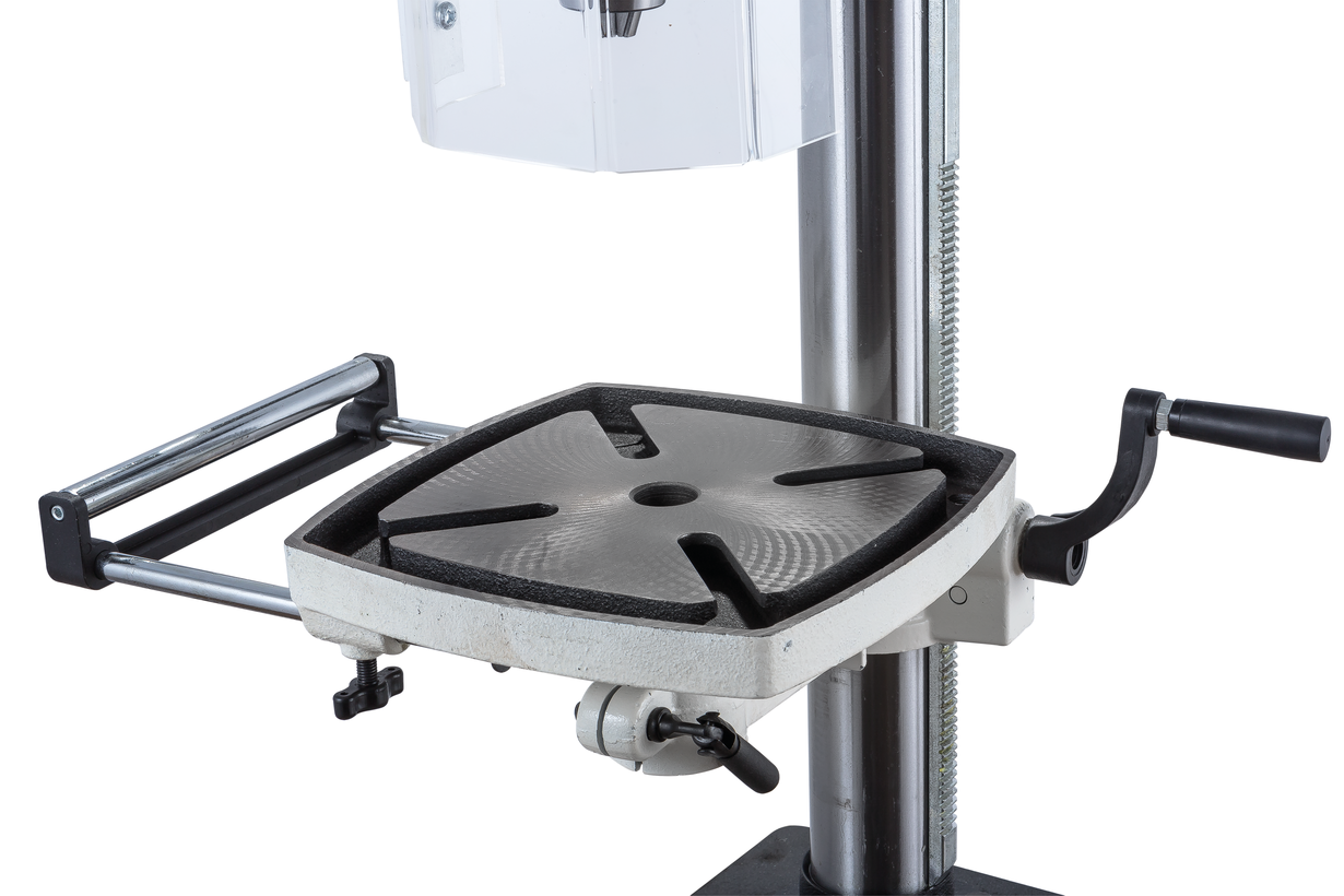 Станок оборудован массивным чугунным столом, имеющим Т-образные пазы для крепления тисков. Стол установлен на литом кронштейне, поворачивается вокруг своей оси и наклоняется влево и вправо на угол до 45 градусов. Кронштейн перемещается вверх и вниз по колонне благодаря зубчато-реечному механизму с вращающейся рукояткой. Рабочая поверхность для установки тисков отфрезерована и на основании, что позволяет работать от него, предварительно сняв или отвернув в сторону стол.