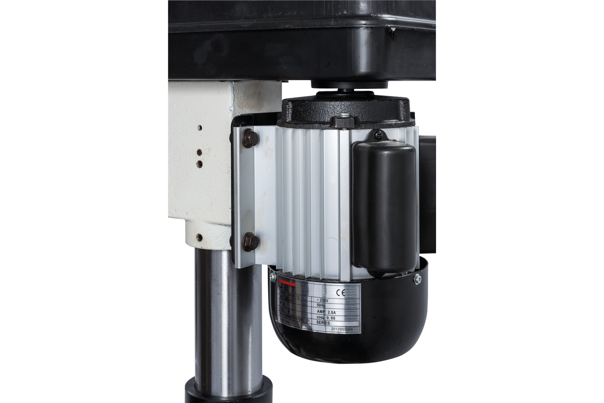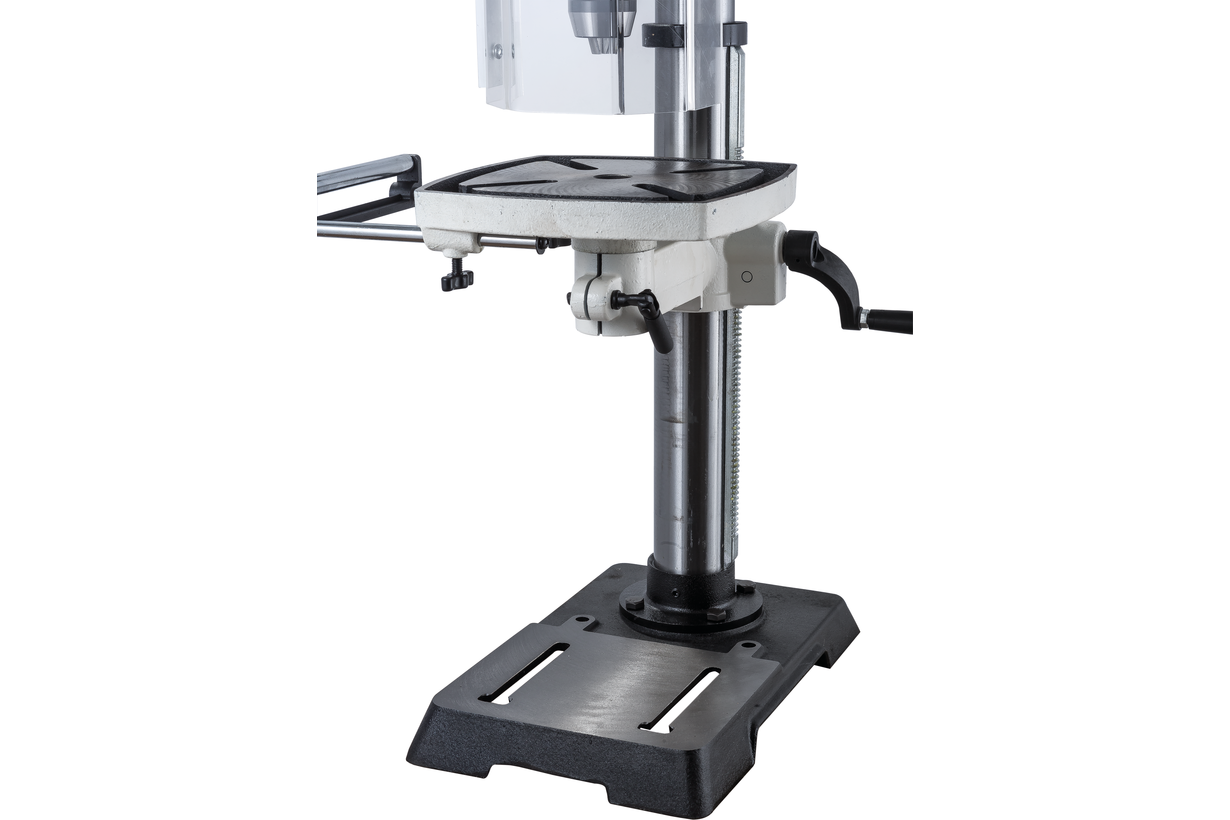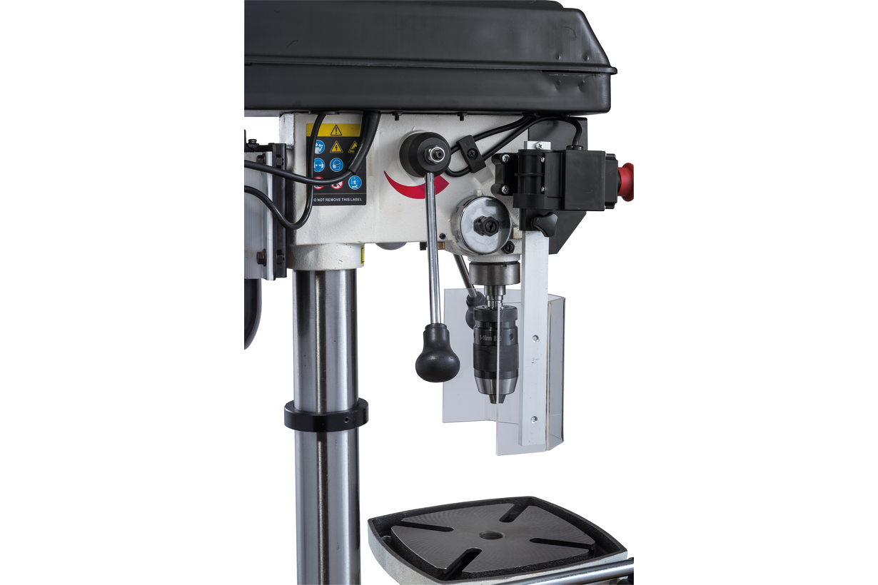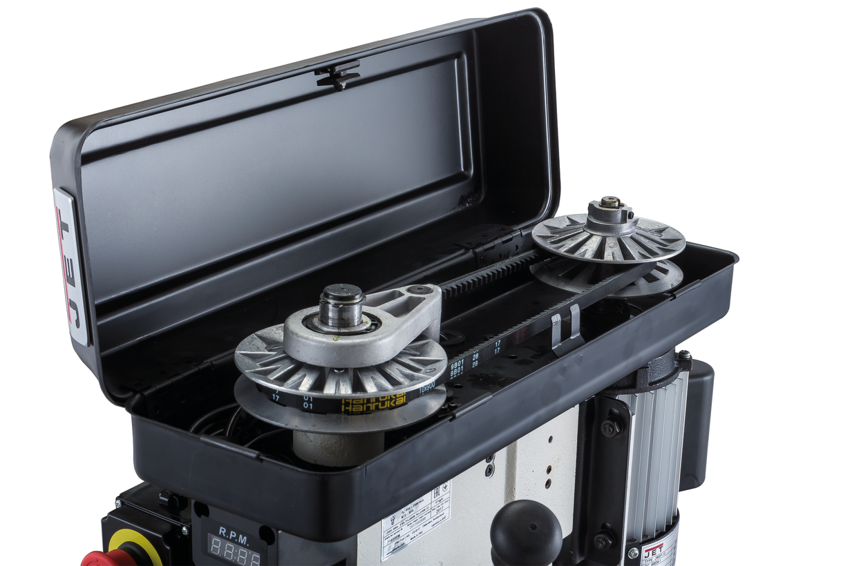 JWDP-12 — настольный сверлильный станок профессионального класса, подходящий для универсального (дерево и металл) применения. Основная отличительная черта этой модели – клиноременный вариатор, позволяющий плавно бесступенчато изменять скорость вращения шпинделя. Такая конструкция механизма ускоряет настройку в зависимости от диаметра сверления: вместо снятия и последующей установки ремня достаточно перевести рычаг, причем делают это, не выключая мотор. При этом фактическая скорость вращения шпинделя будет отображаться на цифровом дисплее, что особенно важно при работе с металлом, когда ограничения по частоте вращения режущего инструмента гораздо более строгие, чем при работе с деревом.