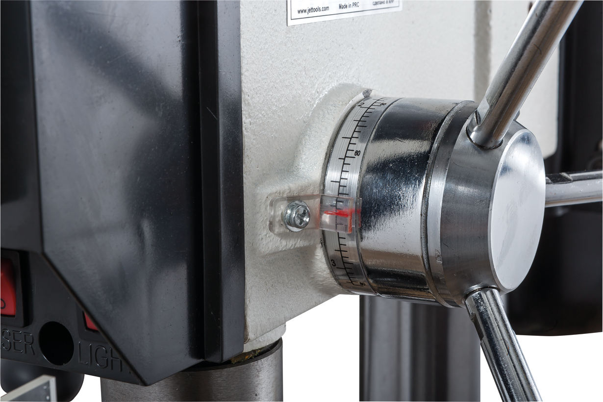 Подача пиноли производится стандартным штурвалом с тремя рукоятками, на его оси лимб для контроля глубины сверления. Кроме того. есть винтовой ограничитель с собственной миллиметровой шкалой, облегчающей настройку положения гайки-стопора. Вес подвижной части (шпиндель, быстрозажимной патрон, режущий инструмент) частично компенсируется спиральной пружиной, у которой можно менять предварительный натяг.