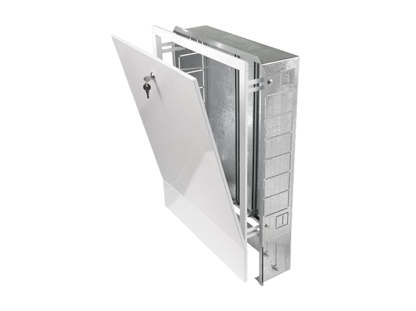 В боковых стенках корпуса шкафа выполнена перфорация, сегменты которой удаляются в любом удобном месте для подсоединения трубопроводов