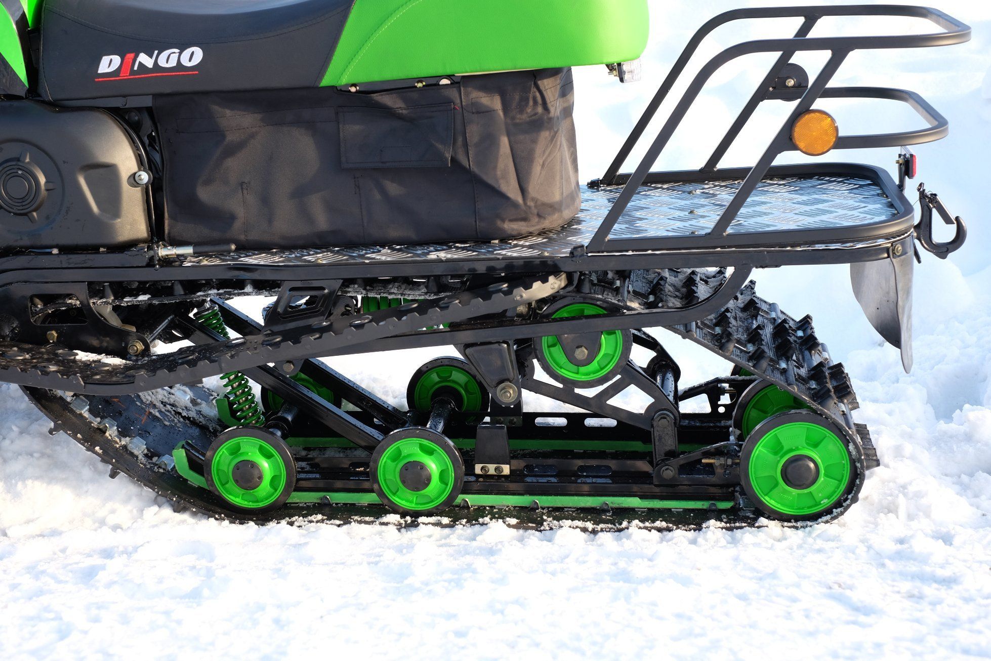 Не осталась без внимания и ходовая часть снегохода Dingo T150 – гусеница снегохода была удлинена до 2 626 мм., грунтозацеп увеличен до 23 мм., а принципиально новая, катково-склизовая подвеска с двумя амортизаторами обеспечивают снегоходу отличную проходимость!