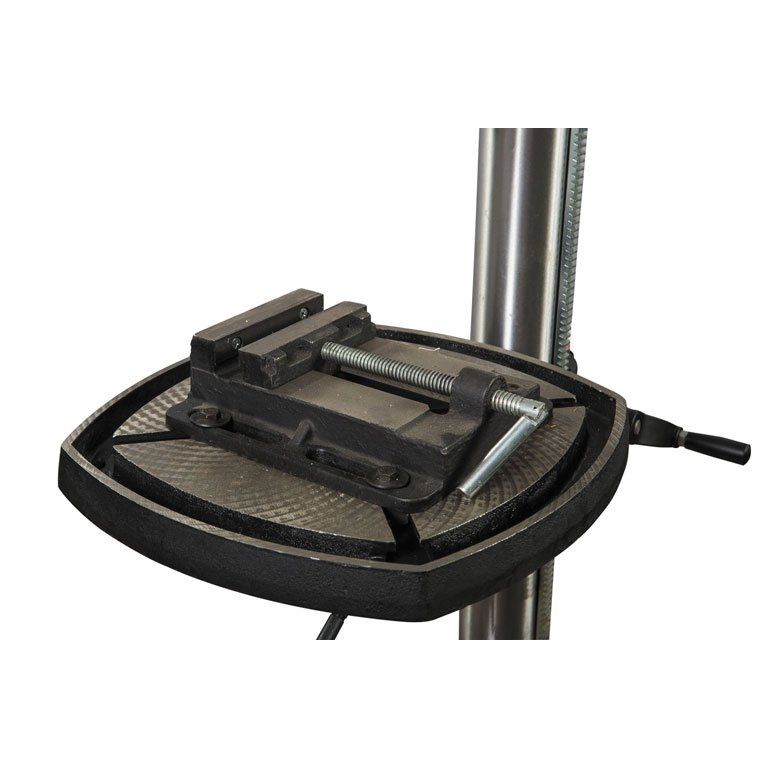 Станок укомплектован чугунным столом, регулируемым по высоте и по углу установки. Сверлильная часть тоже выполнена из чугунного литья. Для контроля глубины сверления предусмотрена шкала с миллиметровой и дюймовой разметкой, а также регулируемый ограничитель. Скорость вращения шпинделя меняется в широких пределах перестановкой ремней в редукторе (он имеет две ступени).